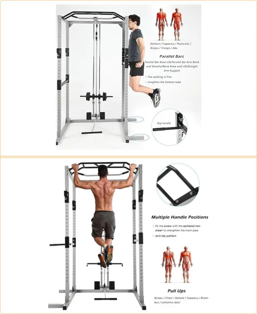 Options de réglage : Vous pouvez ajuster la hauteur des barres et des supports à haltères selon vos besoins pour un entraînement personnalisé, tout en ayant accès à une variété d’exercices pour tous les groupes musculaires.